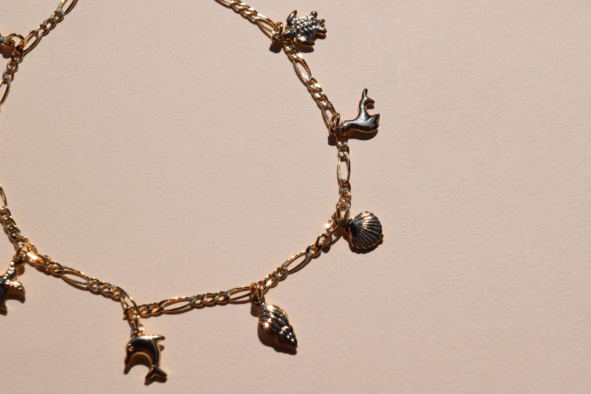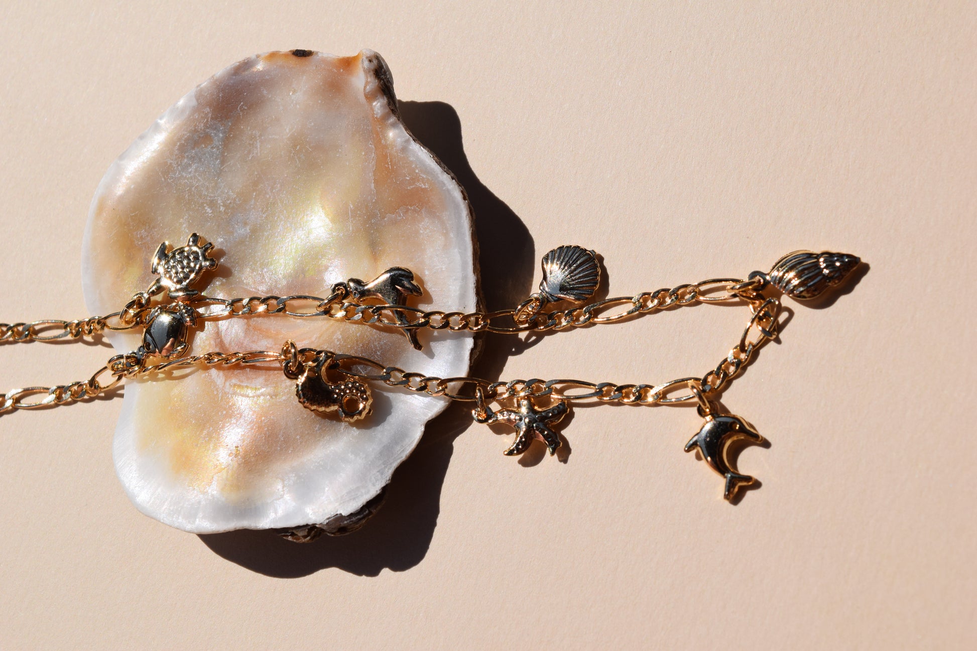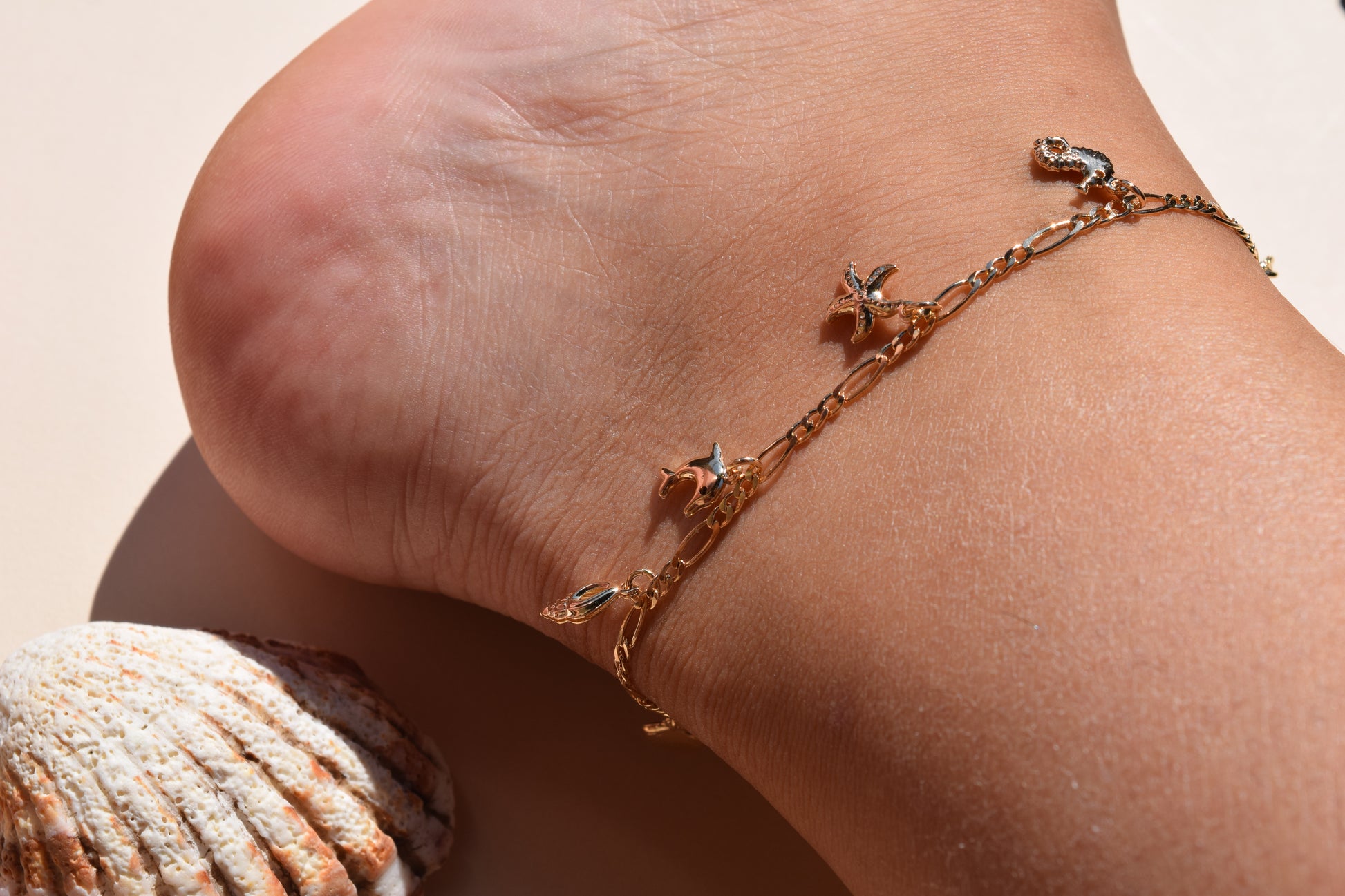 The Under the Sea Anklet brings a playful touch of coastal charm to your jewelry collection. Crafted from luxurious 18K gold, this anklet features a series of intricately designed sea animal charms, including starfish, seashells, and dolphins. The high-gloss finish enhances its radiant shine, while the adjustable clasp ensures a perfect fit. Whether you're strolling by the shore or adding a nautical flair to your everyday look, this anklet adds a whimsical yet sophisticated touch to any outfit.